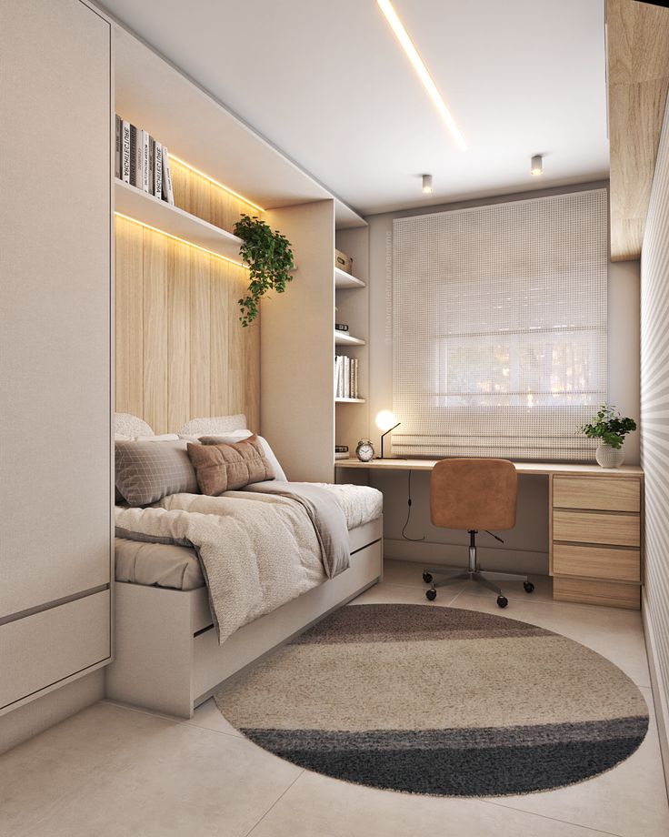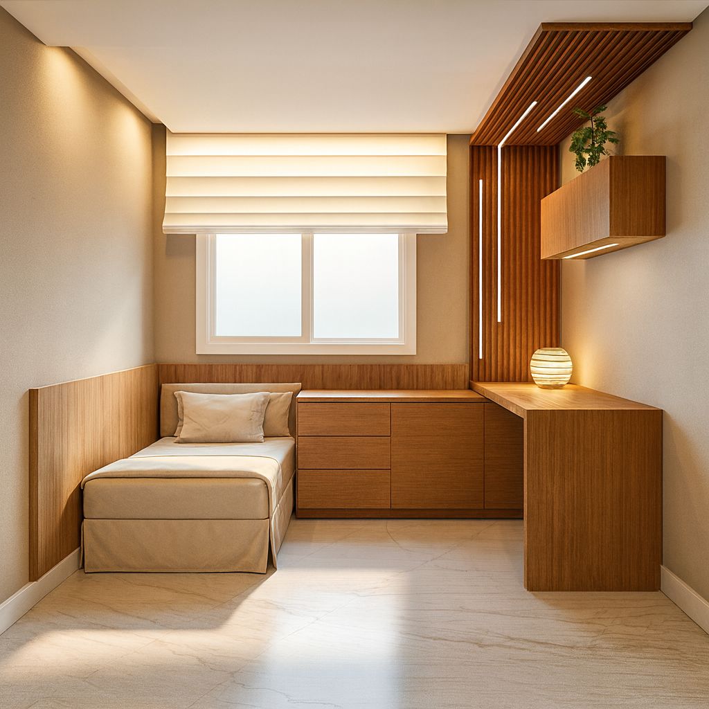 O resultado é um quarto de solteiro que traduz equilíbrio entre forma e função, ideal para quem busca um espaço moderno, confortável e adaptado às necessidades do cotidiano.